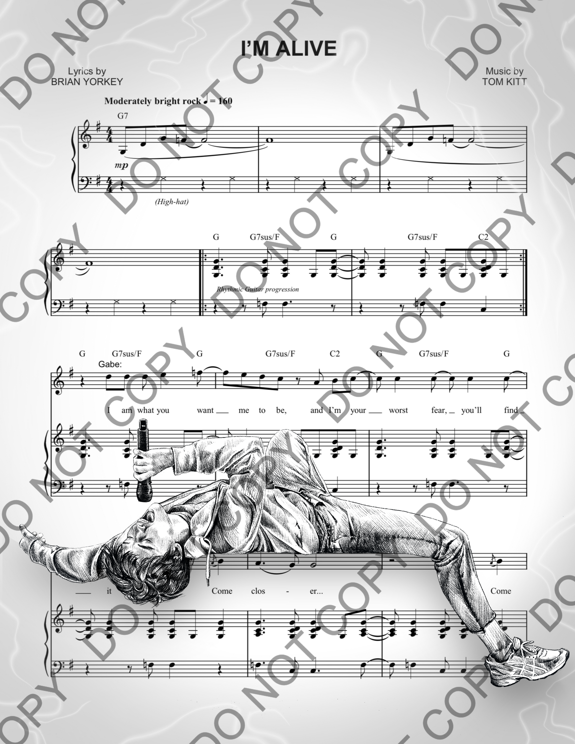 Digitally hand-drawn portrait of Jack Wolfe as Gabe Goodman in "Next to Normal" on the West End. Background is sheet music for "I'm Alive" from the musical. Print is letter sized, 8.5x11in.