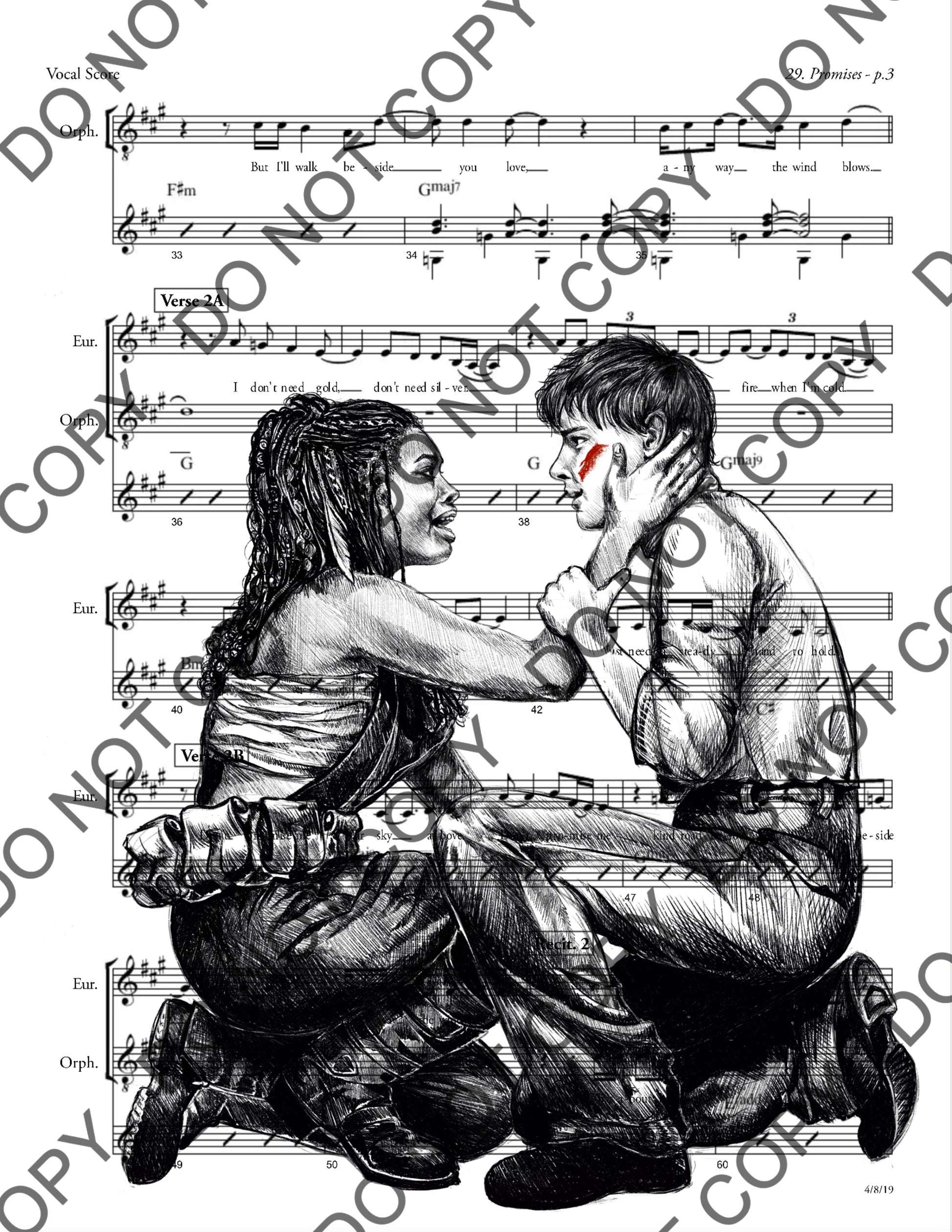 Digitally hand-drawn portrait of Morgan Dudley as Eurydice and Jack Wolfe as Orpheus in Hadestown. Background is sheet music from "Promises". Black and white with a splash of color on Orpheus's cheek. Print is letter sized, 8.5x11in.