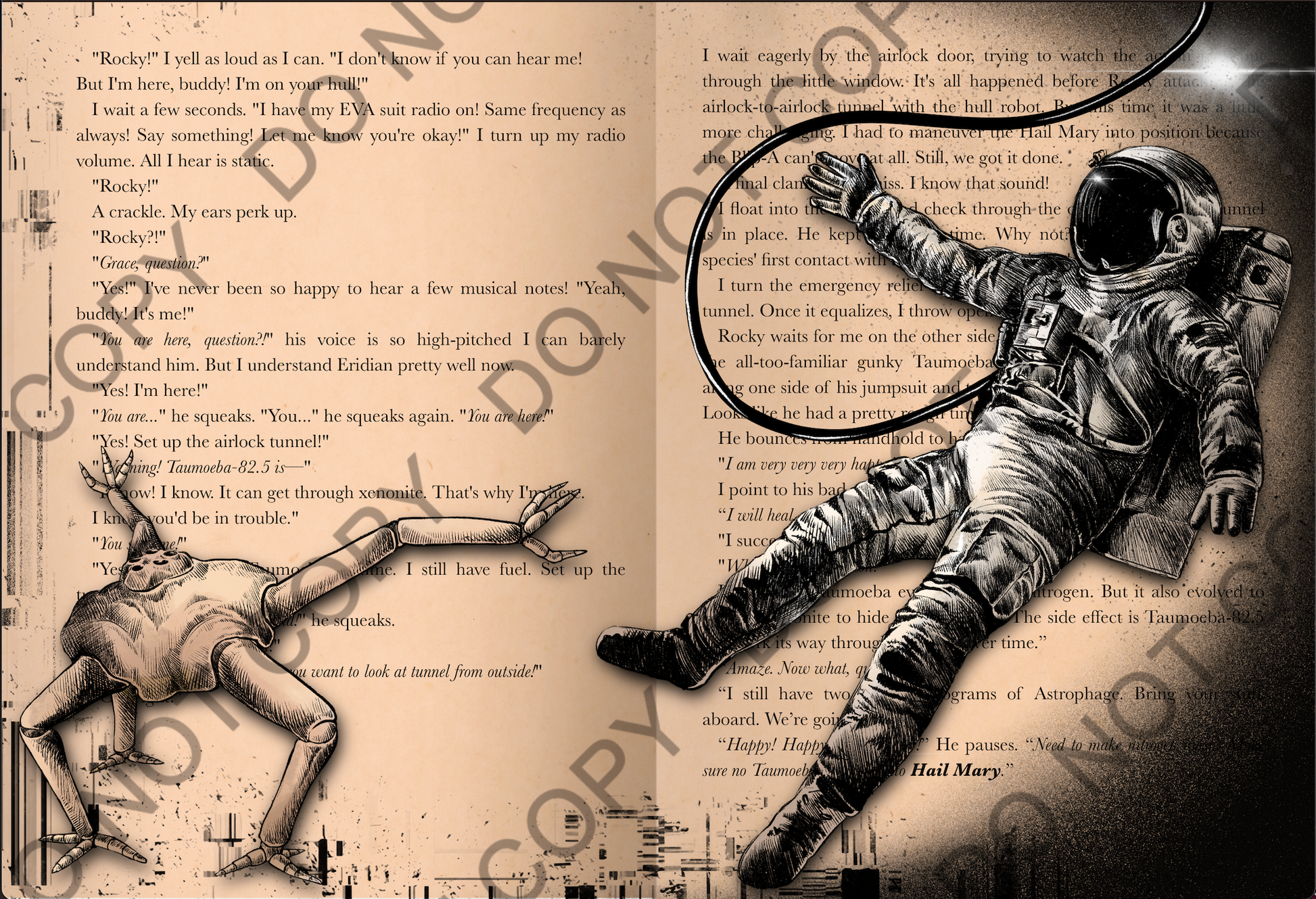 Digitally hand-drawn and colored art for "Project Hail Mary". Background is pages from the book. Print is 9x13 inches.