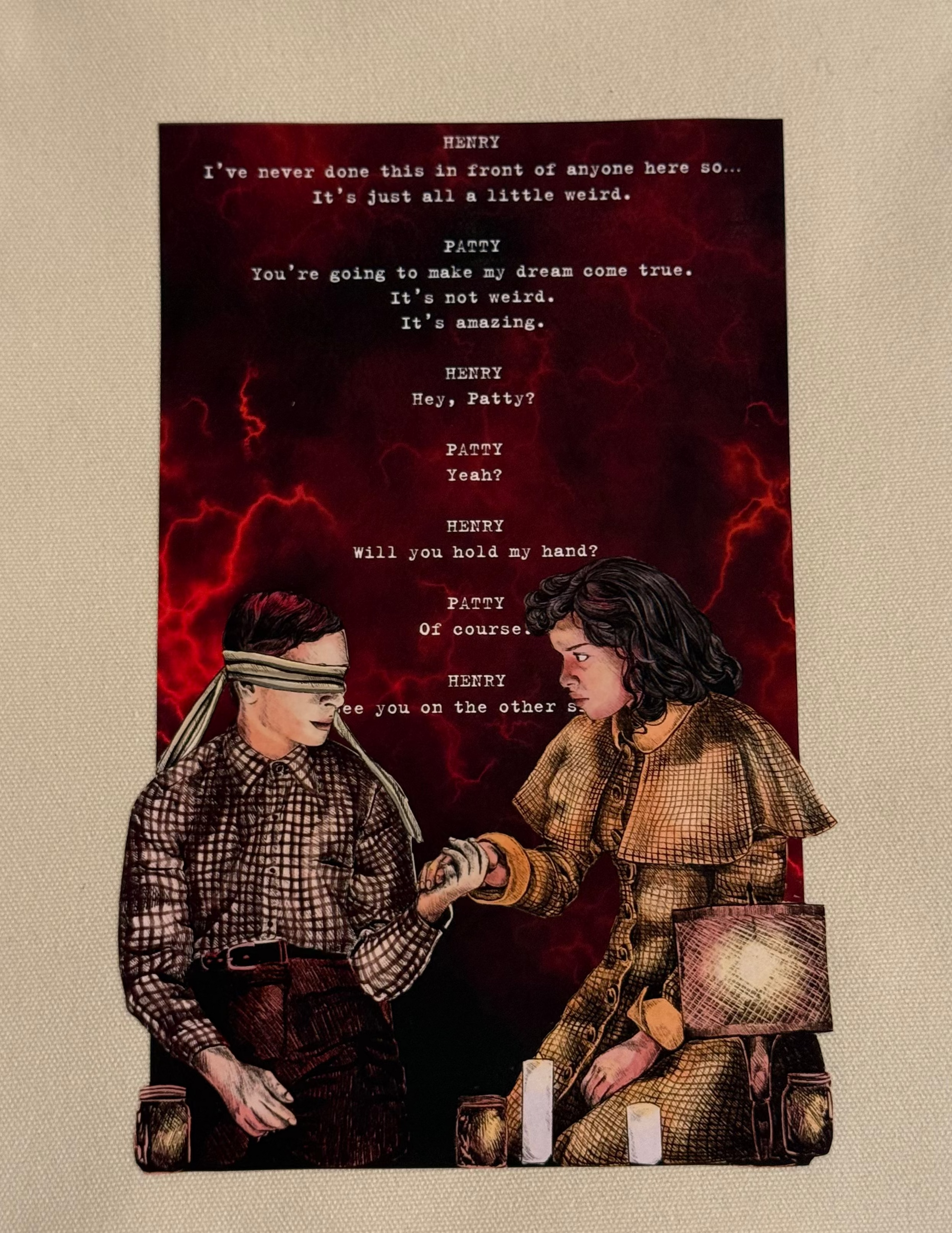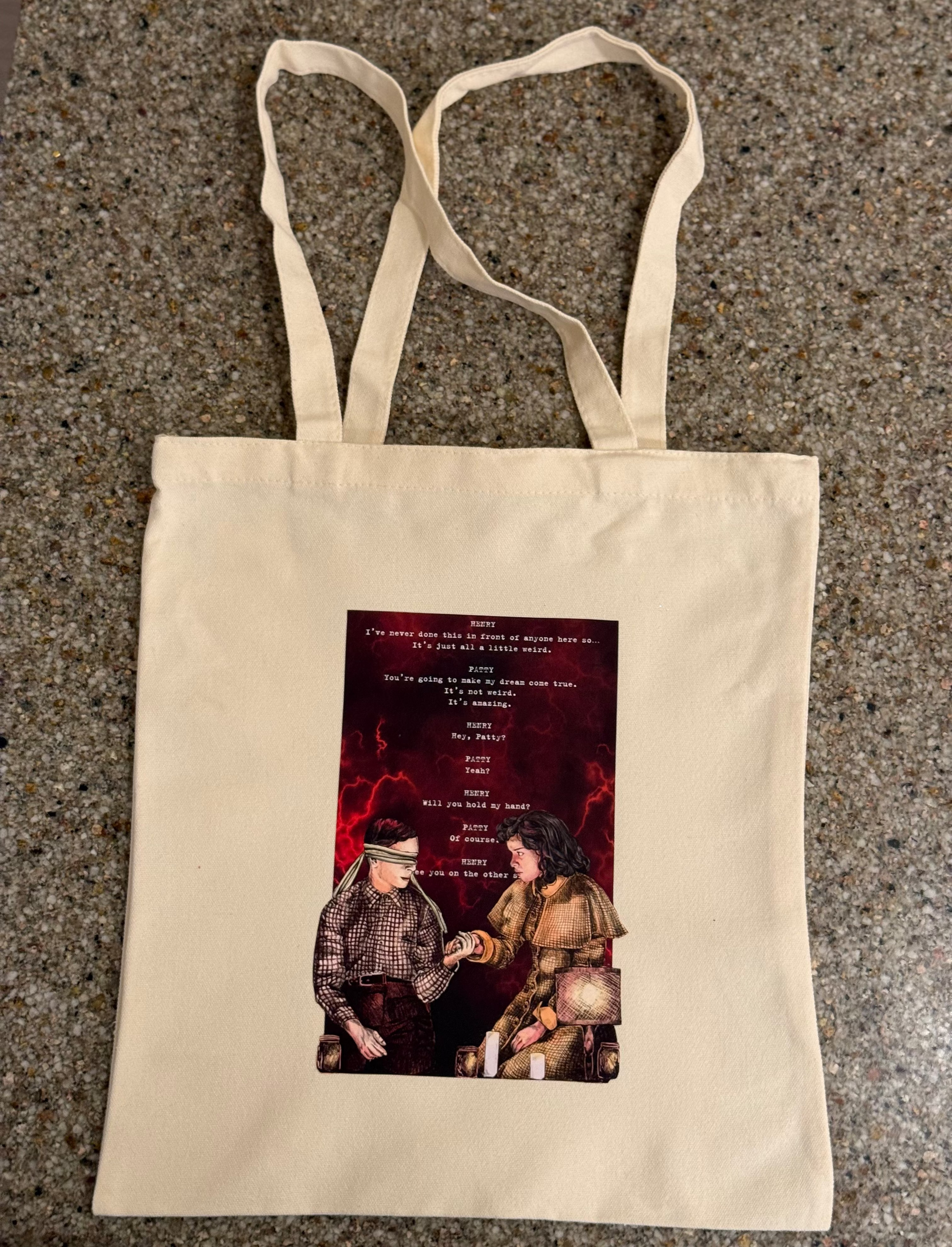 Hand-drawn portrait of Louis McCartney and Gabrielle Nevaeh as Henry Creel and Patty Newby in Stranger Things: The First Shadow on Broadway printed on a canvas tote bag.